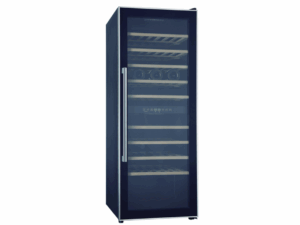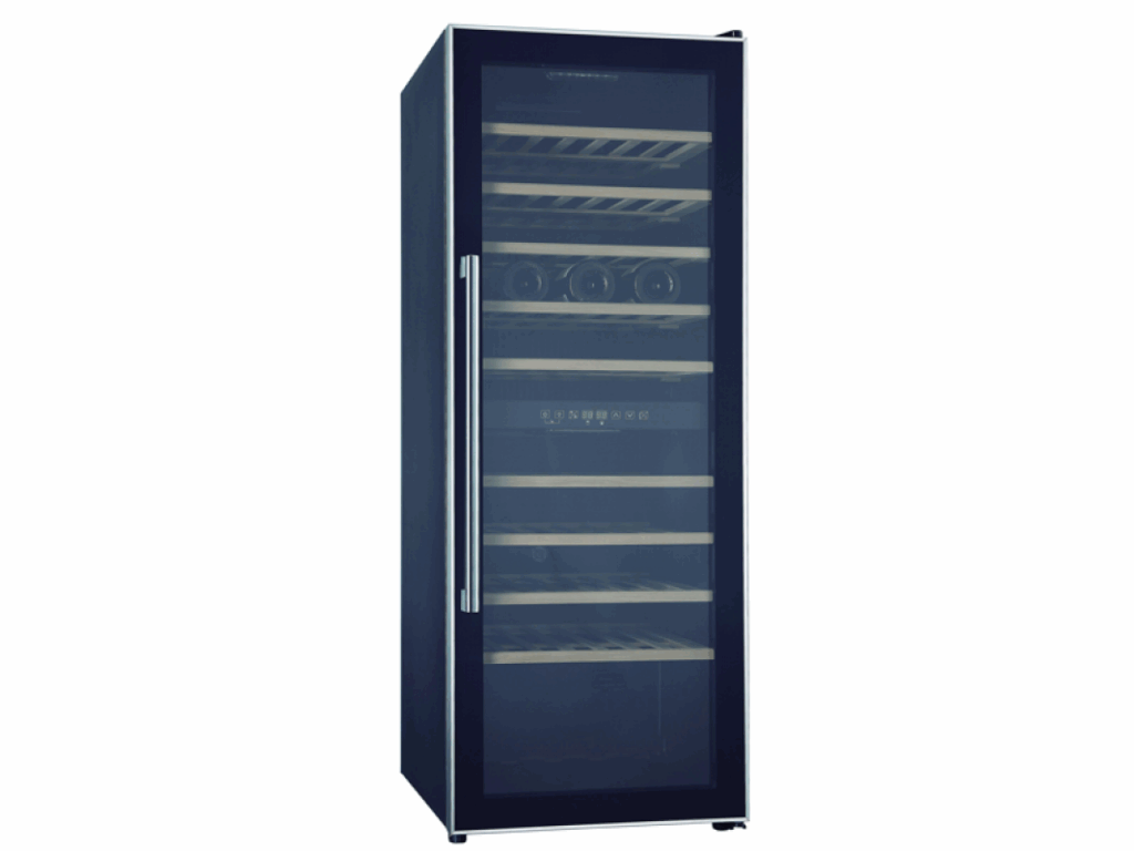 Com capacidade para 77 garrafas, acabamento em inox, 9 prateleiras de madeira, iluminação em LED e refrigeração por compressor, que faz com que a temperatura externa não interfira da temperatura interna. Possui 2 diferentes zonas de temperatura e controle digital separado.
