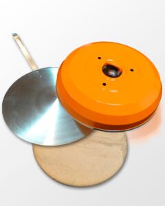 Kit premium composto de pedra refratária, espátula circular em alumínio e tampa de proteção.